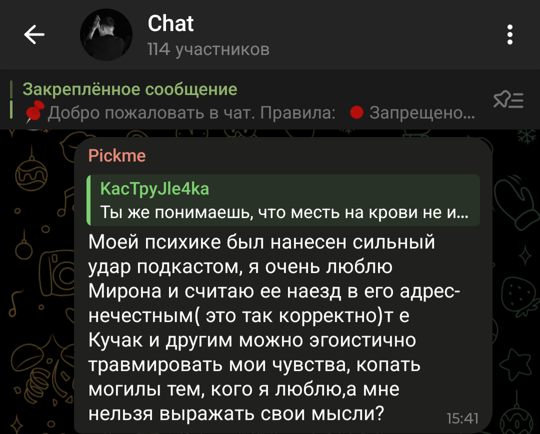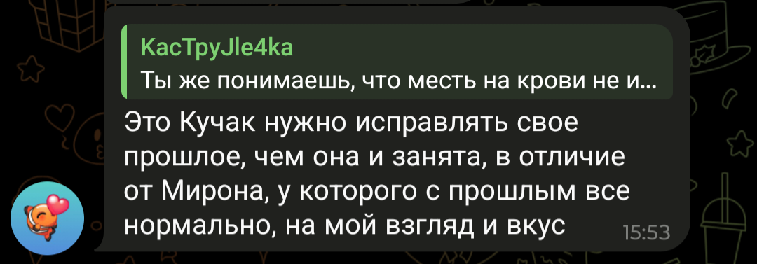 >>1046041 Могу. Я следил года с 18 за Жо Пеши и за Куромой. У меня по многим мимическим, речевым моментам сложилось впечатление, что она под него подстраивается. Не то чтоб я думал, что это специальная операция, а просто, он нашел в 27 девку 20 лвл и начал реально растить под себя. И использовать ее навыки себе на пользу. Хотел он флексить соской, которая компрометирует мир репа, выдавал что веган феминист. Стало удобно другое позиционирование она не отсвечивает. Видно, что именно она ему всегда в рот смотрела. Даже то как он в расставание много использовал ее образ, это точно давлерие, я б так не стал. И то что он добился своего только подтверждает