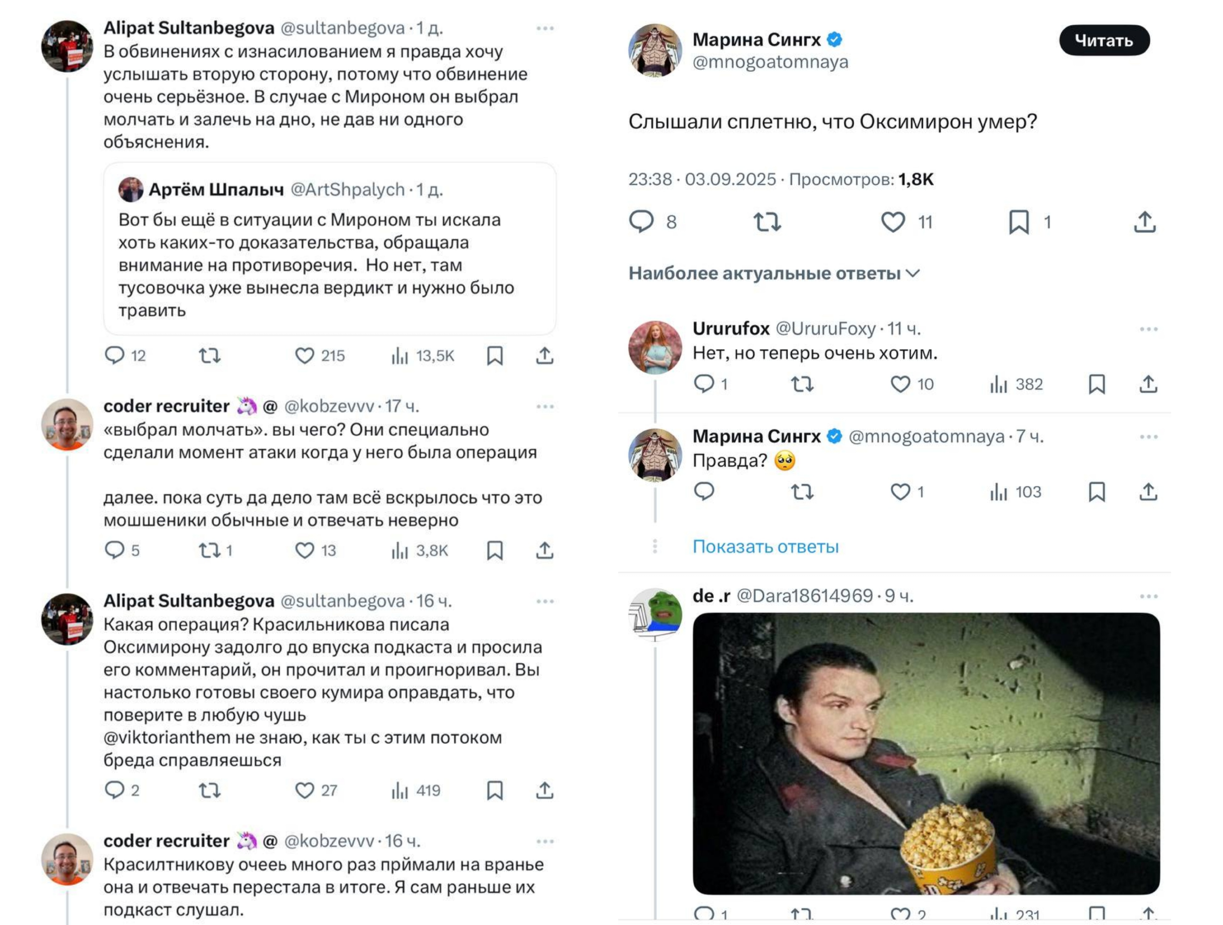Оксижопич всегда был пиздаболом, причём низкого уровня. Пиздаболом, которого легко было подловить и подъебать за его пиздёж, чем и пользовался жопич и другие его критики. В этом и есть трагедия Оксаны Мироновой — он недостаточно умелый пиздун, чтобы создать охуенный образ идеального себя, в который все поверят, и одновременно он недостаточно смелый человек чтобы открыто и честно преподносить себя таким, какой он и есть. Ни рыба ни мясо.