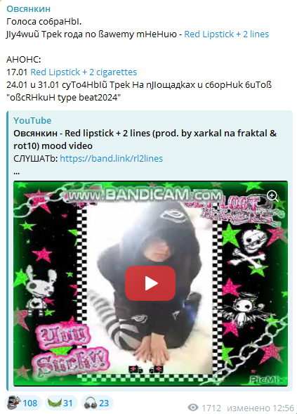 Ну и блять аудитория у овса стала мега уебищная. Одни дети и солевые малолетние альтухи из тиктока которые себе в жопу говно закладывают под подруга девушки на меня ссыт.