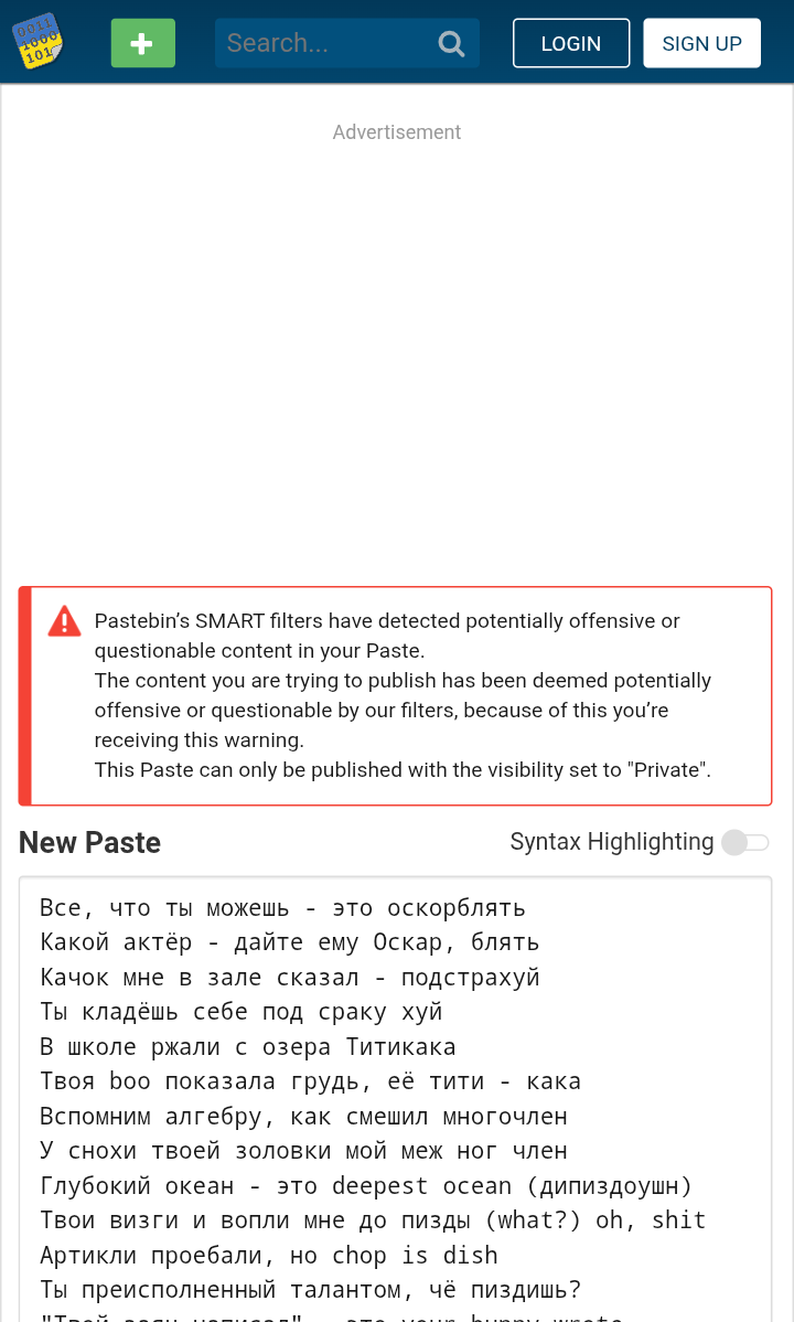 Все, что ты можешь - это оскорблять Какой актёр - дайте ему Оскар, блять Качок мне в зале сказал - подстрахуй Ты кладёшь себе под сраку хуй В школе ржали с озера Титикака Твоя boo показала грудь, её тити - кака Вспомним алгебру, как смешил многочлен У снохи твоей золовки мой меж ног член Глубокий океан - это deepest ocean (дипиздоушн) Твои визги и вопли мне до пизды (what?) oh, shit Артикли проебали, но chop is dish Ты преисполненный талантом, чё пиздишь? "Твой заяц написал" - это your bunny wrote Твой рот с чем-то белым - это ёбаный рот Листва нашуршала, что это твой last beef Не веганом стал, меня боится даже pastebin