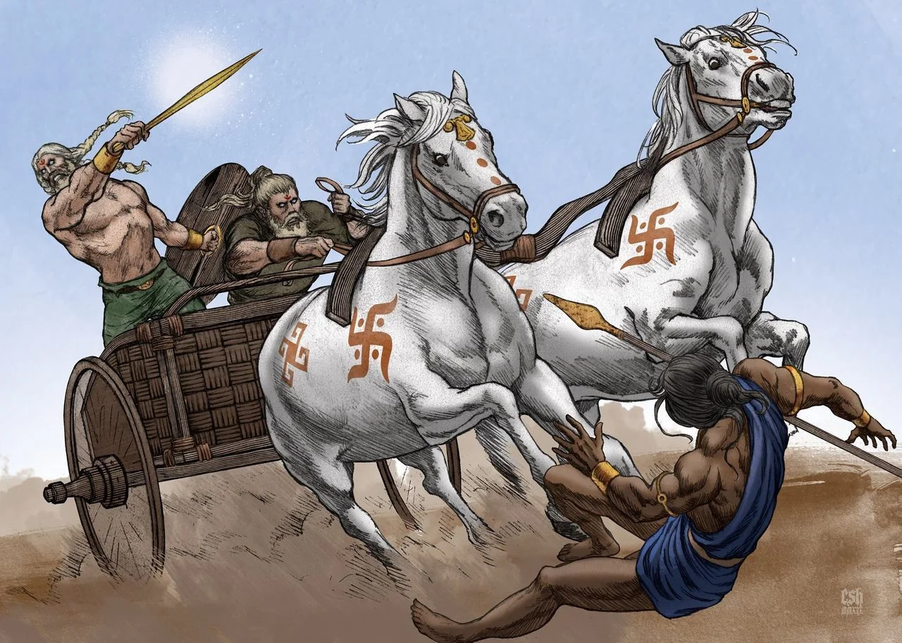 >>1022433 Битвы с чернокожими были в уже Индии, на фоне них миксованные арии действительно выглядели белыми, описание напоминает походы каких-нибудь иранских или афганских правителей в Индию.