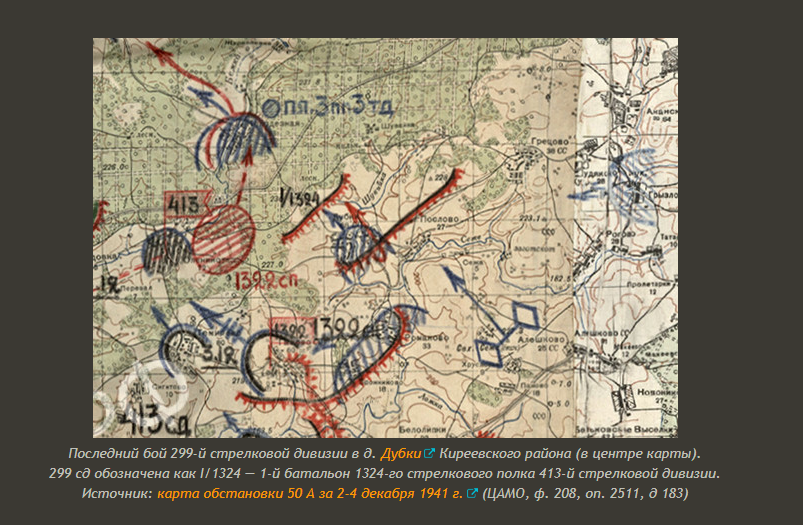 24.10.41 Противник подошёл к реке, район обороны обстреливается артиллерийским и миномётным огнём. Оборона держится стойко. 26 октября вся Белёвская группировка войск получает приказ отойти к Туле для обороны города. 299-я стрелковая дивизия потерялась и была обнаружена по года Сталиногорском (ныне Новомосковск) в начале ноября, то есть более 50 км восточнее Тулы, когда враг под Тулой был уже остановлен. 6 ноября 1941 года остатки дивизии при поддержке 2 батальонов 413 стрелковой дивизии заняли оборону у села Дедилово. 956 полк поддерживал атаку 413 стрелковая дивизия на село Панино, но безуспешно. 11 ноября 41 года от 956-го стрелкового полка осталось менее 500 чел. без артиллерии. 18 ноября 1941 года противник начал массированную атаку на позиции 299-й и 413-й стрелковых дивизии. Целый день 18 ноября шли кровопролитные бои, особенно тяжелые на дедиловском направлении. После сильного танкового удара гитлеровцы захватили населенный пункт Мокрое, приблизились к Дедилово. По нескольку раз из рук в руки переходили отдельные дома поселка. Танки врага обошли населенный пункт с востока, и части 299-й стрелковой дивизии оказались в окружении. Однако это не поколебало боевого духа наших войск, они продолжали стойко обороняться, а потом, поддержанные своими танкистами, прорвали вражеское кольцо и отошли на новый рубеж в сторону года Венёв.
