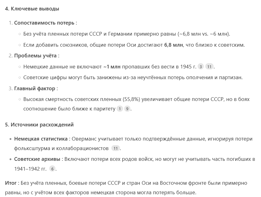 >>993380 Дай догадаюсь, данные по совковым потерям Кривошеевские? Сколько там уже прошло лет тридцать? Можно догадаться что за это время появились новые источники открытые, новые исследования. А по немецким данным Оверманс учитывает и как раз попытался рассчитать потери 1945, его как раз критикуют за завышение цифр фрице патриоты, по его расчетам по моему немцы без союзников на восточном фронте потеряли вроде 4 миллиона. >>993441 >Явно ближе к истине Тебе то откуда известно? Ты же берешь цифры не потому что там больше источников использовано, свежие исследования, а просто по тому что тебя устраивают цифры указанные в исследовании.
