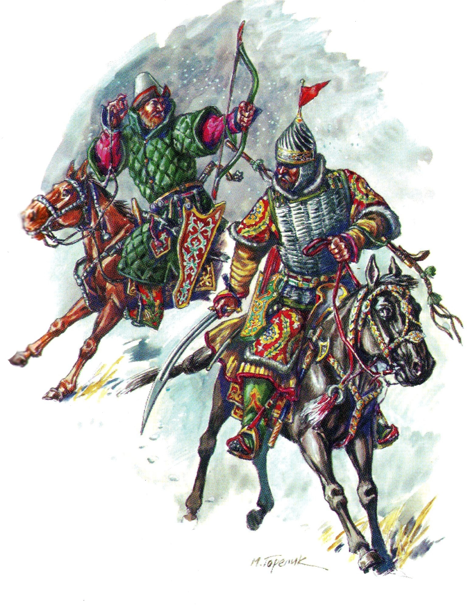 >>983458 >>983459 Абсолютное фэнтези от антиисторичного фрика Федорова. Как говорит всеми признанный эксперт в военном деле Руси Юрий Кулешов, наручи-сахновки появились только в 15 веке, а шатровидные бацинеты только со второй трети 15 века. Также никаких ламелляров никто на Руси в конце 14 века не носил, нет никаких находок ламеллярных пластин, а есть только полностью их вытеснившая чешуя. Шлемы ордынцев тоже фэнтезийные.