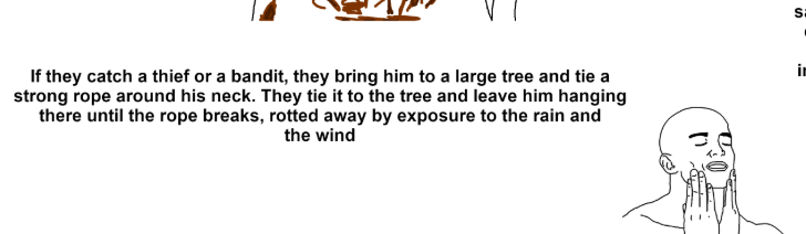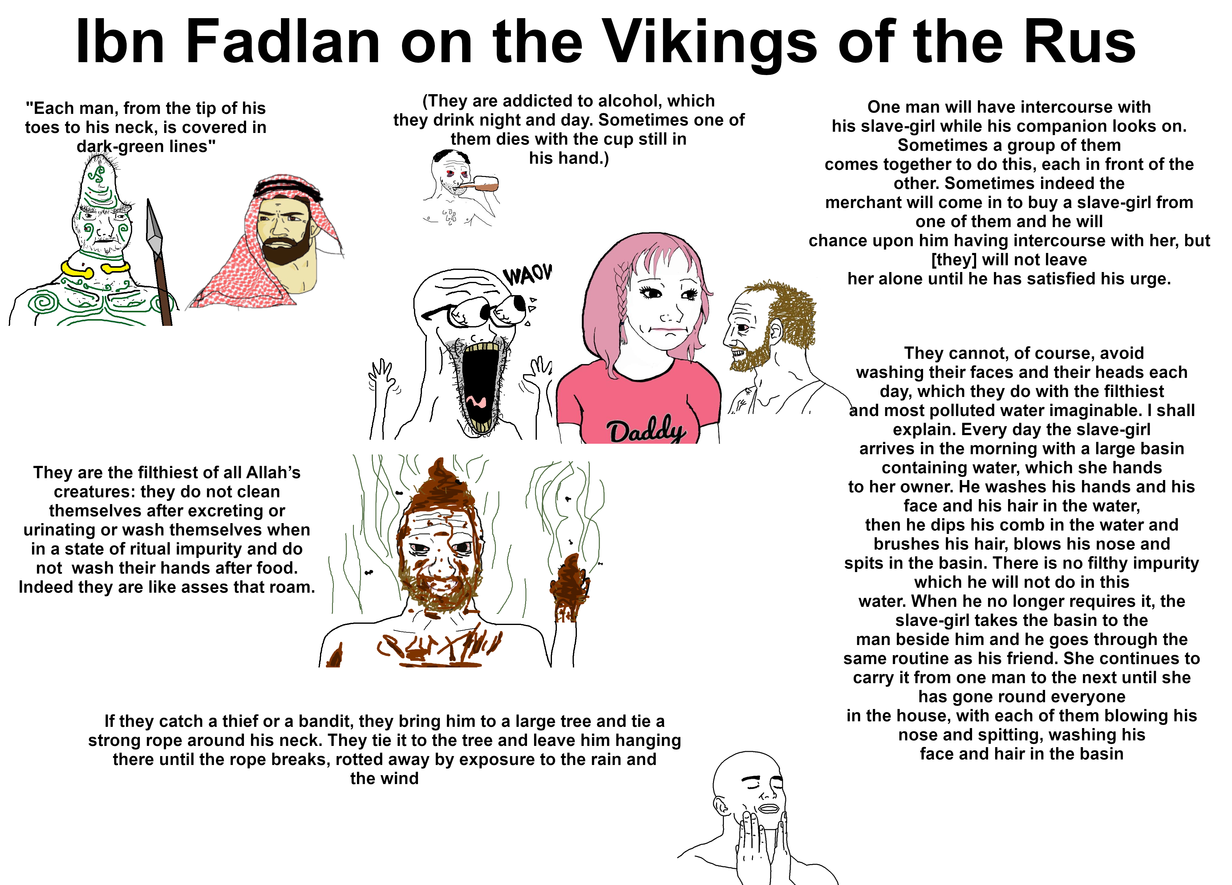 https://en.wikipedia.org/wiki/Ahmad_ibn_Fadlan >Русы появляются как торговцы, которые открыли магазин на берегах реки недалеко от лагеря Болгар. Они описываются как имеющие тела высотой с (финиковые) пальмы, со светлыми волосами и румяной кожей. Каждый из них татуирован от «кончиков пальцев ног до шеи» темно-синими или темно-зелеными «рисунками», и все мужчины вооружены топором, мечом и длинным ножом. >Ибн Фадлан описывает русов как идеальные физические образцы, а гигиену русиййа как отвратительную и бесстыдную, особенно в отношении секса (который они совершают открыто даже в группах), и считает их вульгарными и бесхитростными. В этом его рассказ контрастирует с рассказом путешественника Ибн Рустаха , чьи впечатления о русах были более благоприятными, хотя это было приписано, возможно, преднамеренному неправильному переводу, поскольку оригинальные тексты больше соответствовали повествованию Ибн Фадлана. Он также очень подробно описывает похороны одного из их вождей ( погребение на корабле с человеческим жертвоприношением ). Некоторые ученые полагают, что это произошло в современном комплексе Балымер >Они — самые грязные из всех созданий Божьих: они не очищаются после испражнения или мочеиспускания, не моются, находясь в состоянии ритуальной нечистоты после коитуса, и даже не моют руки после еды. — Ибн Фадлан