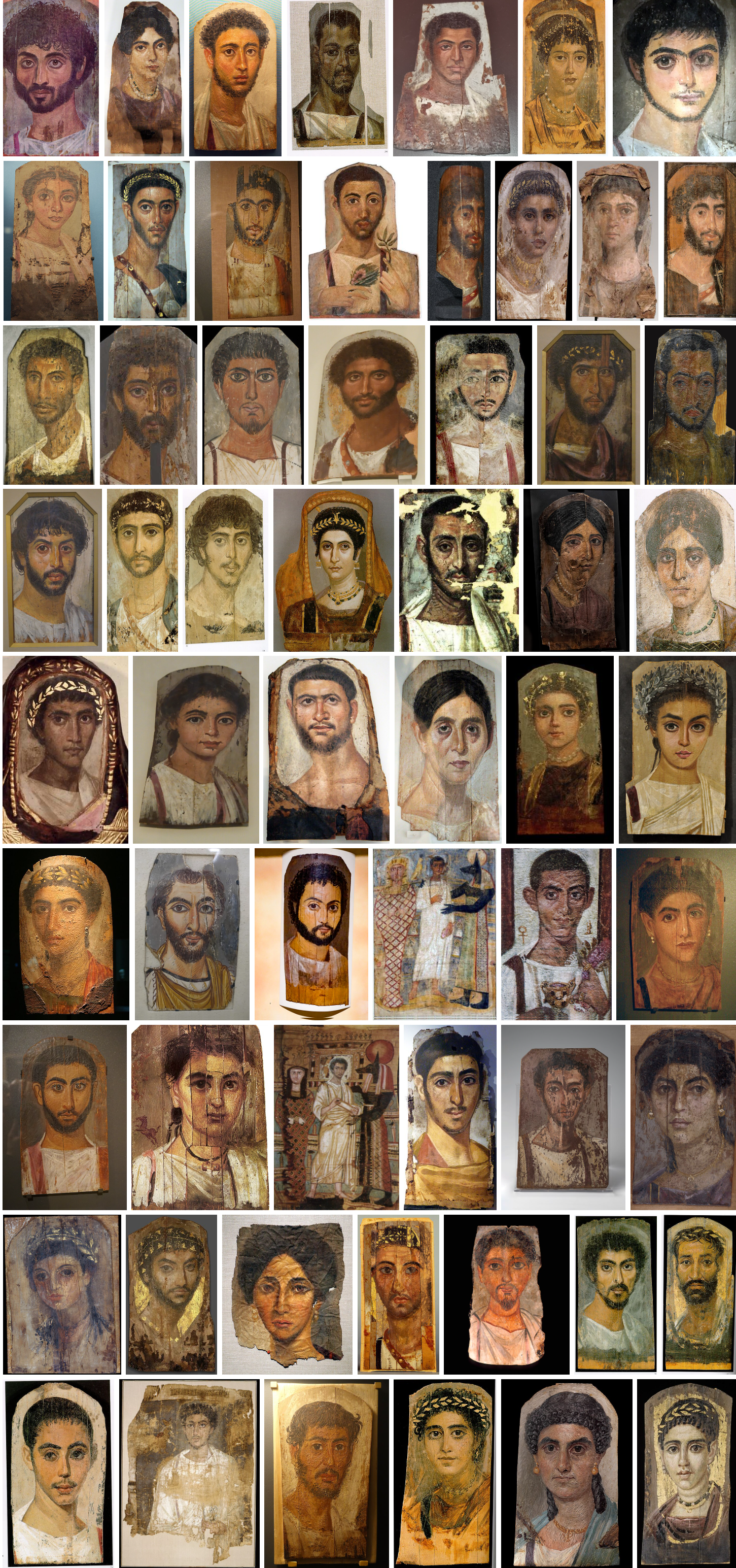 https://en.wikipedia.org/wiki/Fayum_mummy_portraits >Портреты мумий или портреты фаюмских мумий — это тип натуралистичных портретов , нарисованных на деревянных досках, прикрепленных к мумиям высшего класса из Римского Египта .