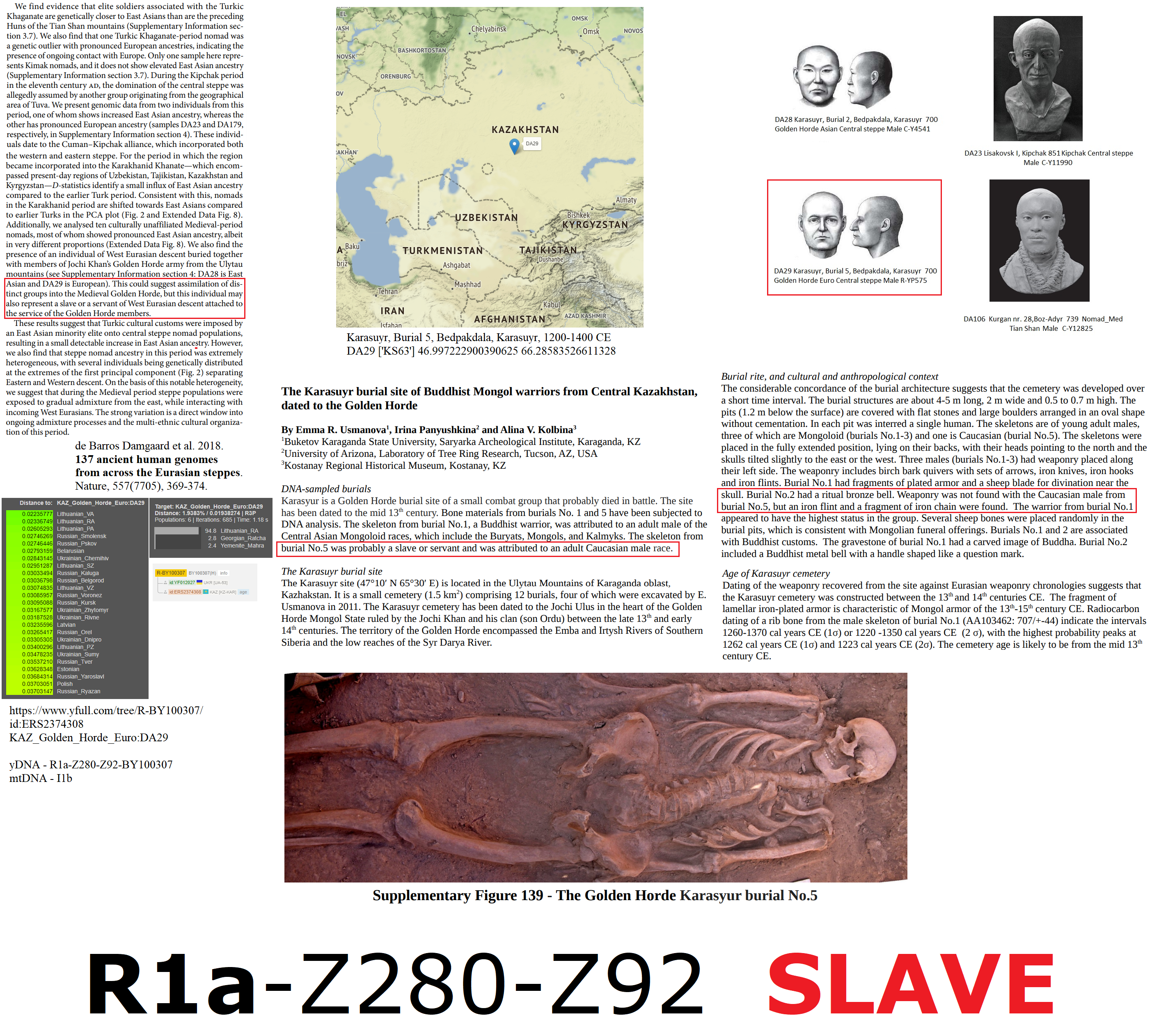 >>995143 >В монголоидном источнике не было Q(Khosovgol LBA) зато Q был в андроново и Срубной. Чего блядь? Ты субклады сравнил или нет? Судя по всему к срубной или андровской могут относится только первые 2 Q из списка, остальные вроде от тюрков >Потому что славянин не может быть пиздоглазой н1цвинячей нечестью, это логично. Полностью согласен, русские и слэйвяне это только R1a/I2 >«Говникс и Туркмении» это и есть Яз, датировка железный век. Нет, думай ещё. Попробуй посчитать на тетрадке чтобы не забыть цифры, можно считать столбиком >Независимый исследователь не будет вообще читать источники где написано что хрюзня это славяне, но нет генетических данных это подтверждающих, большинства источников говногпт таковыми и являются. То есть страна которая говорит на славянском языке, имеет R1a на уровне хохлов и ничем внешне и по образу жизни от них не отличается - типа не славяне? Типа независимый исследователь не будет это брать во внимание и будет заранее считать что русские это как финны? Нереальный копиум