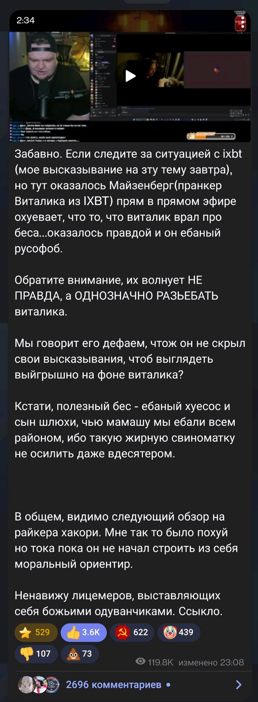 Последние новости: - Михас выпустил разъёбное разоблачение, где прошёлся не только по IXBT, но и по DeadP47. Оказывается, хейтеры "доносчика Витали" сами строчили кляузы на неугодных. Никогда такого не было, и вот опять!