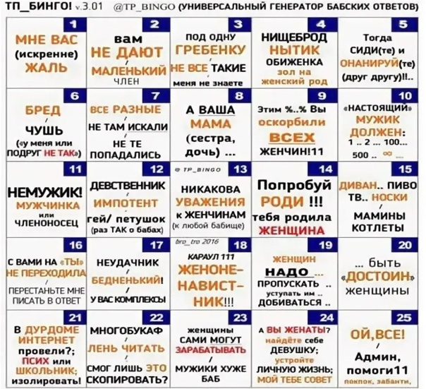 1. Хамелеон: Притворяться и подстраиваться. С феминистками восхищаться феминизмом и независимостью женщин. С «матриархами» (традиционными женщинами) — восхищаться традиционными ценностями, семьей и материнством. 2. Ядовитый змей: Создавать раздор. Критиковать матриархов в разговорах с феминистками (обвиняя их в иждивенчестве), и критиковать феминисток в разговорах с матриархами (обвиняя их в разрушении семьи). 3. Китайский путь: Сохранять силы, отдыхать, заботиться о здоровье. Действовать только когда враги (женщины разных лагерей) ослабят друг друга. 4. Сталкер: В случае реальной опасности выживать любой ценой. 5. Затаившийся медведь: Нападать на противника, когда у того проблемы. Извлекать выгоду из трудностей женщин. 6. Император: Не ввязываться в борьбу с «рабами» (т.е. с обычными мужчинами-«баборабами»). Бороться с рабами должны другие рабы. 7. Лёд: Сохранять хладнокровие. Не радоваться проблемам врагов, а даже проявлять сочувствие, продолжая использовать Стратагему 1 («Хамелеон»). 8. Законник: Не давать повода посадить себя в тюрьму. Соблюдать законы страны, чтобы оставаться на свободе для дальнейшей борьбы. 9. Феникс: Использовать новые организации, процессы и людей (например, мужские движения) для продвижения своих идей под новыми вывесками. 10. Хитрый торговец: Обменивать небольшие уступки для женщин на большие выгоды для себя. 11. Рычаг Архимеда: Давить на болевые точки женщин для достижения своих целей с минимальными затратами. 12. Дипломат: Заключать временные союзы с кем угодно против общего врага. 13. Кукушка: Заимствовать идеи противника (феминисток или матриархов), но менять их суть, оставляя форму. 14. Путь дурака: В непонятной ситуации прикидываться глупым, чтобы избежать ответственности или скрыть свои истинные намерения. 15. Искуситель: Использовать слабости женщин (например, тщеславие, жажду внимания) для достижения своих целей. 16. Золотое яблоко: Ссорить женщин между собой (как Эрида подбросила яблоко раздора богиням), чтобы они боролись друг с другом, а не с мужчинами.