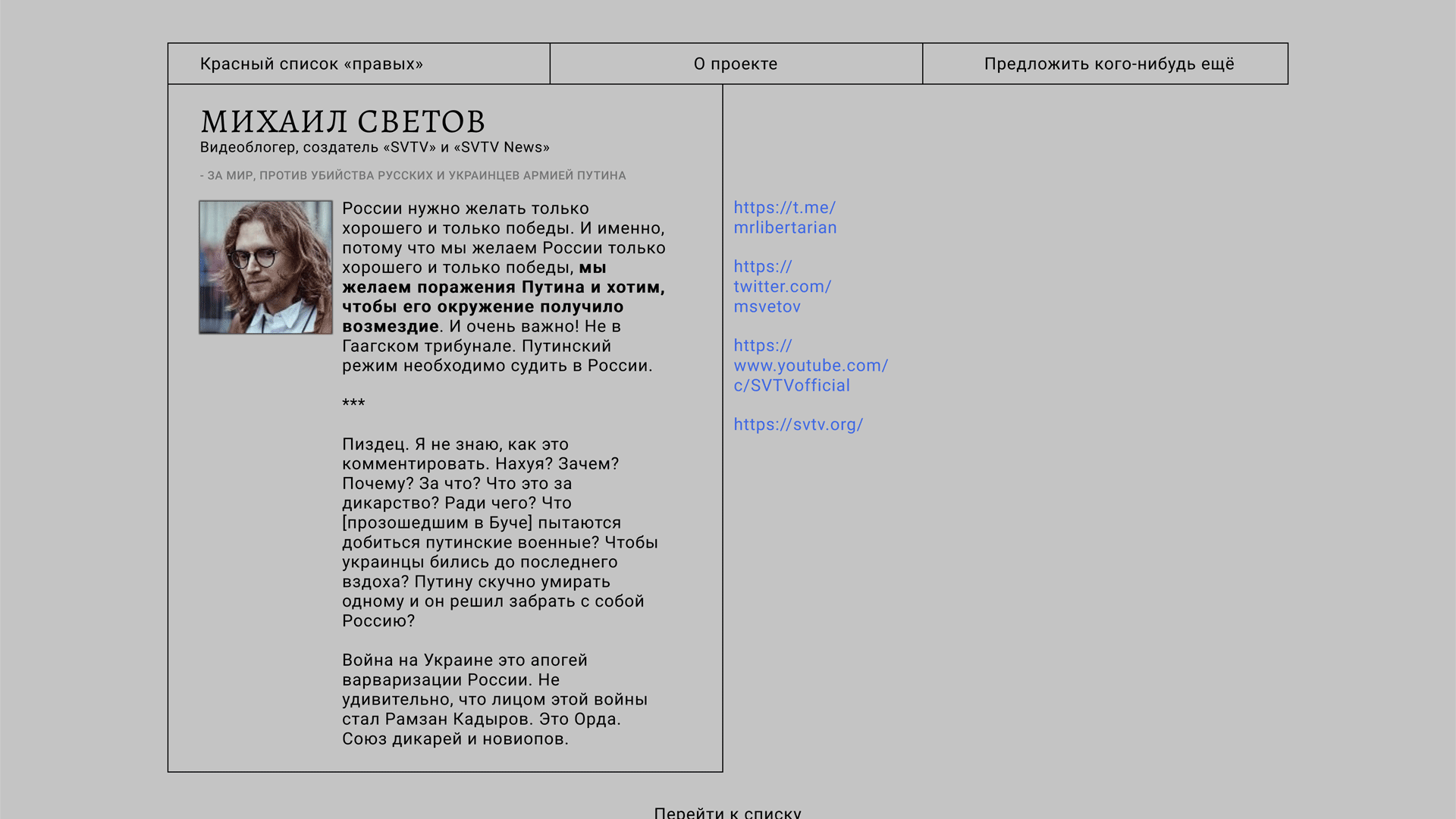 1. Михаил Светов развалил либертарианскую партию своим цезаризмом и стремлением взять всю власть в свои руки, наплевав на партийные институты 2. Светов пиздел о борьбе с наркоманией в руководстве партии, хотя сам назначал на ключевые должности торчавших Конвея, Соню Блейд и т.д. в рамках фракции Принципы и Дело 2.5. Светов говорит о себе как о наркофобе, который не стал бы иметь никаких дел с наркоманами, но при этом рекламил галлюциногенные грибы в свтв ньюс 3. Светов подставил активистов под задержания на митинге за телеграм: он знал, что менты будут винтить людей с воздушными шарами, но никого не предупредил ради красивой картинки 4. Светов продвигает как единственно верную самую отталкивающую для непосвященных версию либертарианства — хоппеанство. В итоге либертарианство имеет в России репутацию либо манямирка, либо криптофашизма для стесняющихся зиговать школьников 5. Светов первым сбежал заграницу еще до февраля 2022го года, бросив две организации и один бизнес на произвол судьбы 6. Светов лицемерен по отношению к фри раше. По его словам, она не сделала ничего хорошего для русских, но именно фри раша вывезла чуть ли не всю верхушку ЛПР из России. Даже Конвей понимает это и высказывается в стиле "Я не согласен с их политической программой, но благодарен им за помощь мне и моим друзьям" 7. Светов по мироощущению как был жжшным троллем-щитпостером, так и остался. Половина его постов в твиттере — провакации, троллинг и наброс говна на вентилятор, из-за чего серьезная половина не воспринимается всерьез 8. Светов оторван от реальности, живет в своем манямире, что было предопределено богатыми родителями и усилилось после эммиграции 9. Предыдущий пункт предопределяет его неспособность внятно и доступно излагать мысли. Светов говорит витиевато, зачастую намеками, в стиле Галковского (чувствуется жж нулевых), зачастую не объясняя контекст, который лично для себя считает очевидным. Отсюда все эти "переформулирую, чтобы не вырвали из контекста" и зачастую недопонимания со стороны других оппозиционеров 10. Светов обещал создать либертарианское сми, но создал желтушный паблик в стиле лентача, где постит новости про сисястых трудовиков, жирных негрореперш и спизженные новости с русских оппозиционных/зарубежных правых сми. Олды помнят, как в первые месяцы существования Светов буквально лепил вотерку на спизженные видосы поверх вотерки издания, у которого видос взят 11. Светов собрал около 16 миллионов рублей на открытые корреспондентского корпуса. Корпус так и не был открыт 12. Светов обвиняет других в балабольстве, но сам не делает ничего кроме унылых стримов уже годами. То есть даже не политическую, а публицистическую/теоретическую деятельность не ведет. Где обещанные написанные книги по либертарианству? Где развитие русской либертарной политической мысли? 13. Светов зачастую лицемерен, имеет ряд проблем с внутренней логикой отдельных высказываний или мнений. Например, постоянно акцентирует внимание на национальность черных преступников, латиносов или хачей, но выступает против коллективной ответственности, если речь заходит о русских. Или, например, считает, что нелегальные мигранты — преступники, но при этом заявляет, что наеб государства на пособия/разрешение на пребывание в стране — база, потому что государство нам должно. Естестве