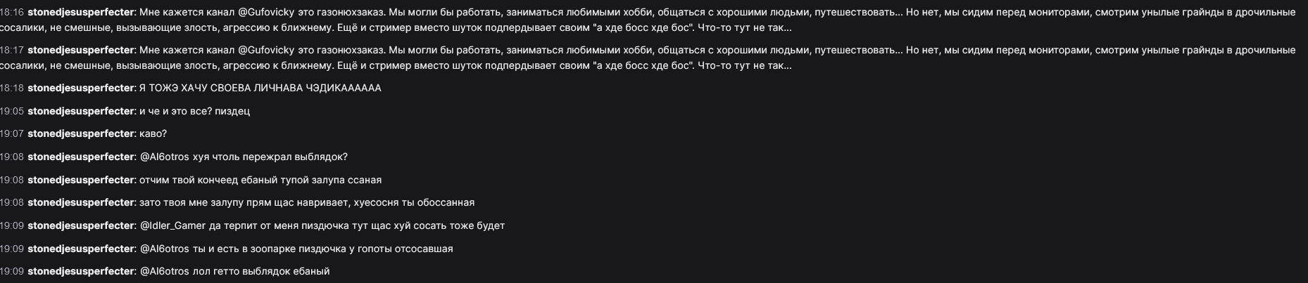 Шизло в треде прочно поселилось, как же бесит, что из-за того, что гуф не делает контент пришлось заглянуть сюда . У него родители и кошка, мб с двумя ирл друзьями, что вам надо от простачка ? Он общается в интернете, для нынешних времен осторожно, с тысячей людей, смотрите бустичат . Кстати, кто-нибудь знает - почему у него нет регистрации канала ? ( Жирно намекаю, через это, если надо - деаноньте ) Тут насрано, что, обиженный донатер школьник тут ссыт на два треда уже ? Давно смотрю Каргаса и других блоггеров . Гуф умер .