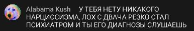 Альсо вспомни его первое появление после двухнедельного перерыва ежедневных стримов, когда полчата обосралось и стало его искать, донатить патлатому чтобы тот ехал его проверять, пока он всех игнорил - какое оно было? Просто сидит радужное самодовольное ебало, с упоением лицезреющее кучу внимания в свою сторону. Никаких "сорян ребят, в общем не было настроения, пытался очухаться, так что не обессудьте", нихуя. Просто ноль отклика, ни какой дружелюбной эмоциональной связи с аудиторией. Нарциссичный пидор как есть, на второй месяц стримов заебался и стал демонстрировать своё истинное ебало. Всё прочее "а давай сравним каких баб я ебал и каких ты" туда же.