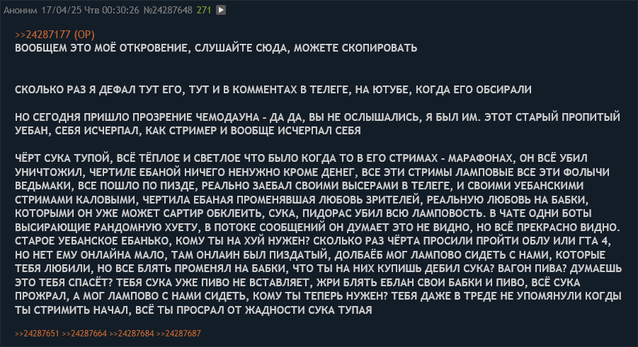 >>1085896 >Ну что, в этот раз точно все? Можно хоронить кумира и консервировать записи стримов? Остался только Илья Давыдов Да нихуя не все. Он в телеге сказал что еще надо 17 стримов отстримить. А это еще несколько месяцев. После чего он сказал что НАВЕРНО уйдет из стриминга https://t.me/maddysontg/5023 >1:11 стримить ради рекламы 2 раза в неделю я не прекращу. Нужно отстримить еще 17 стримов, а после этого совсем НАВЕРНОЕ уйду в радио молчание. ЕСЛИ конечно не появится какого нибудь ИНТЕРЕСА к стримерской деятельности.
