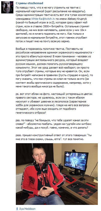Есть более простой способ заебать Чмодье не обогащая его. На Твиче если тебе в донате кто нибудь пишет "Мэд, ты согласен с нами что мы правильно ёбём хохлов под Авдеевкой?" то нельзя поддерживать такую провоенную точку зрения, иначе модерация твича решит что ты пропутинский пропагандист и твой канал на твиче забанят. Помню стрим где он возил грузы в Евро Трак Симулятор на грузовике, и его часа полтора заебывали такими стримами на нем, а он каждый раз вынужден был говорить "Ай ЯЙ ЯЙ ЯЙ не одобряю!" и "ОЙ ОЙ ОЙ осуждаю!". С твича этот стрим он удалил https://m.twitch.tv/videos/2010997077 но осталась короткая нарезка хайлатмена с этого стрима https://www.youtube.com/watch?v=BECnSGZ1pyQ >17:59 донат: Илюха спасибо за эксид, в него за раз 5 ящиков снарядов влезает >Мэд: Ай-яй-яй-яй! В этой нарезки такой донат один или два, а на полном 6-часовом стриме их было штук 12-15