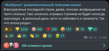 https://t.me/maddysontg/5023 >1:11 стримить ради рекламы 2 раза в неделю я не прекращу. Нужно отстримить еще 17 стримов, а после этого совсем НАВЕРНОЕ в радио молчание. ЕСЛИ конечно не появится какого нибудь ИНТЕРЕСА к стримерской деятельности.