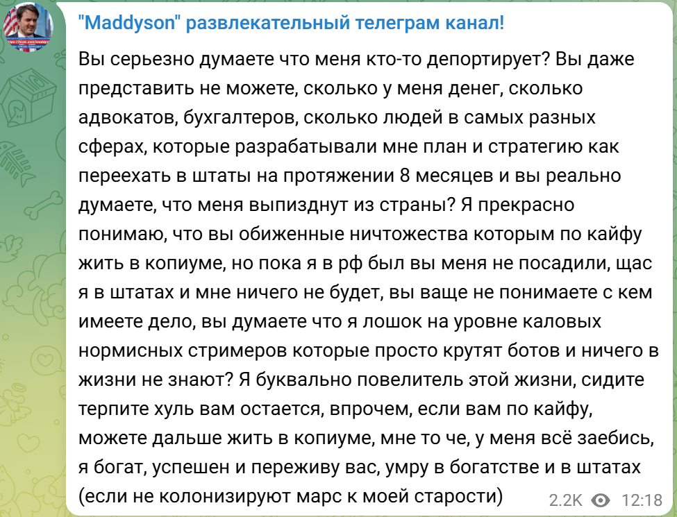 Но таких НАВЕРНОЕ было уже несколько раз. Он временно прекращал стримить, после чего у него заканчивались бабки и он все равно возвращался. Так же будет и сейчас потому что он сказал что никогда не пойдет на завод или работать на обычной работе https://t.me/maddysontg/5024 >2:00 стримить это не на заводе работать, но я бы и на заводе не стал бы работать >9:20 все что я делал в стриминге я делал для того что бы не вернутся в ёбаное Эльдорадо