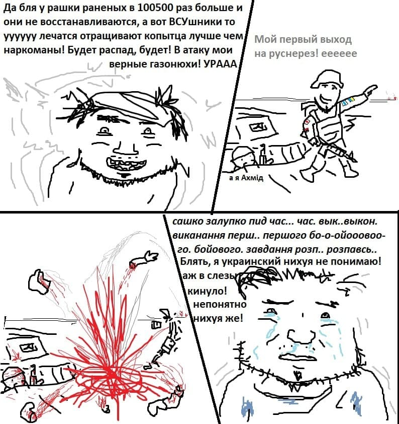 >>1037556 Это просто классика политического украинства. Помню в разных пабликах было время когда шутили над случаем, когда таджикская тетка ходила по улицам с отрубленной головой ребенка. Тогда тоже было немало шутников, хихикавших про игру в футбол головой, а на всех кто возмущался реагировали примерно как уберкуколд с "смеяться можно над всем, кто несогласен тот вата пидорашка". Правда после начала невойны этим мамкиным циникам это припомнили и вдруг оказалось, что смеяться над дохлыми украинцами на самом деле аморально ну и полетели баны естественно. Нет никакого цинизма, просто над русскими смеяться можно, а над великими украми нельзя, познаеш всю соевую ярость.