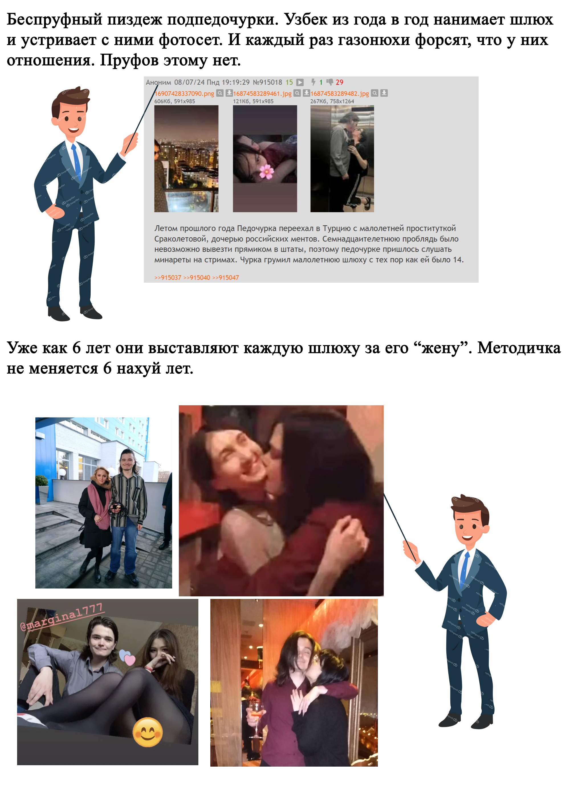 6 лет назад педочурка полетел в москву и снял проститутку Алису, наделал с ней фоточек и подрядил газонюхов форсить, что это его девушка. Потом аноны нашли её анкету на сайте проституток "золушка" и чурка пошел в отрицание. Учёл ошибку и нанял сороколетову, по факту тоже шлюха, которая с 12 лет ублажает мужиков, но инди, без публичной анкеты. Слетал к ней в 2022 в волгоград, наделал переможных фоточек, и вот газонюхи по той же методичке форсят, что теперь она его девушка. Наверное бы хоть кто-то повелся на этот форс, если б чурка не обнищал и смог бы позволить слетать к ней снова и наделать актуальных фоточек.