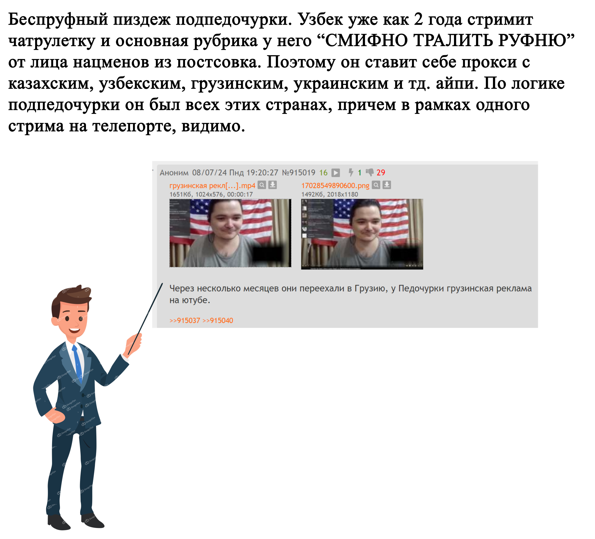 У узбека за флагом продолжается стена, а у шлюхи там окно или картина, хуй разберешь, какая-то объемная хуйня. В то время как у узбека флаг на совершенно плоской поверхности, ничего не выпирает. Пиздец, этот дебил реально ей платит, чтоб она покупала всю эту хуйню, записывала тикток, а потом подпедочурка СЛУЧАЙНО это каждый раз как КАЦКЕР взламывал ее СЕКРЕТНЫЙ канал и сливал это, и его никак не могут вычислить годами, ух штирлиц какой.