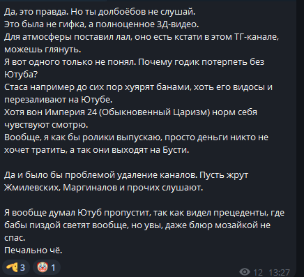 >>1045783 >у русских побанены платформы и проблемы с платой донатов Толя даже сейчас умудряется собирать донаты в рублях (имеет аккаунт в Tribute). А если бы не высказывался против русских, сохранил бы аккаунты в Твич, Бусти и т.п. Даже из забаненных систем можно выводить деньги через других людей. У Толи знакомые, которые могли бы ему помочь, точно были