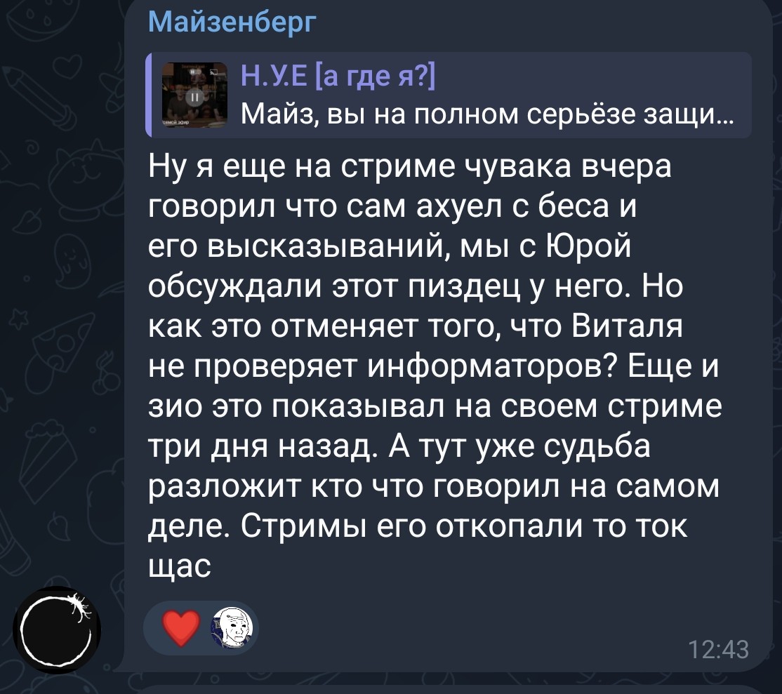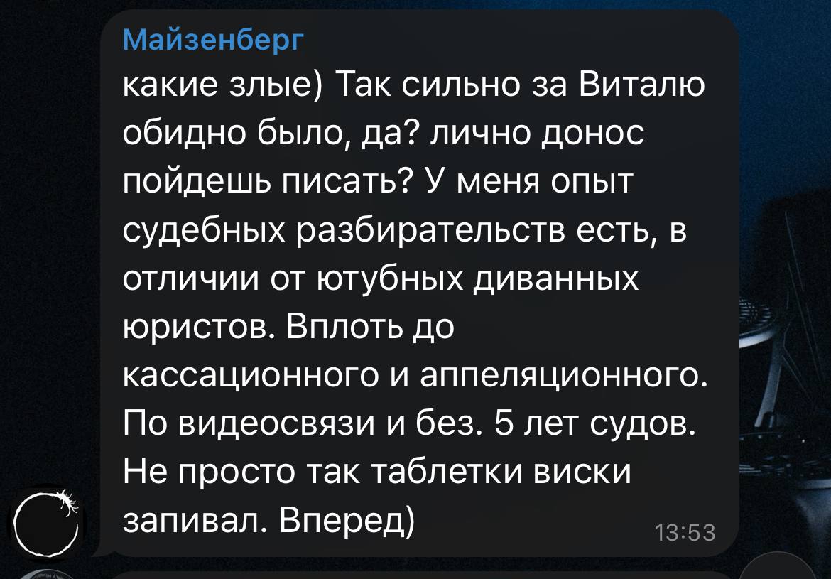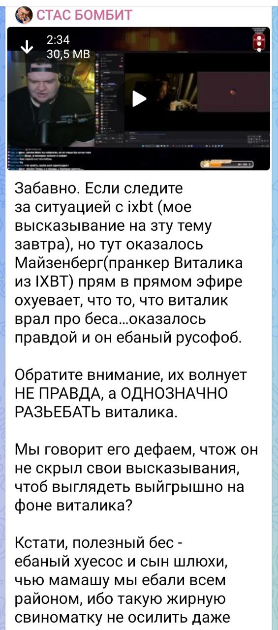 Виталик обосрался, причем я подозреваю что Виталику специально скармливали троли инфу про Беса который реально является русофобом и постоянно на своих стримах обсирает Россию и русских. А финт Майзенберга это только финал был этого тролинга.