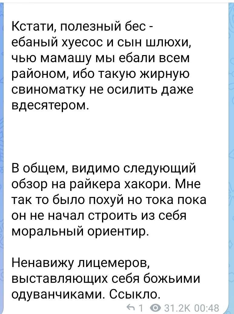 >>1049798 Ага, а не потому что он туда писал и хотел, чтобы овлы ему инфу сливали, но его послали так же, как и бес. У виталика все становятся хохлами, если компания не хочет перед ним отчитываться. Что касается заказа на виталика от купикода или еще кого - хуйня. Эти барыги быстрее спортиков наймут местных, чтобы виталик в больничке со сломанными ногами лежат. Плюс всю эту хуйню сам виталик начал изначально, кинул в тг у себя клич в сливу компромата на беса. Т.е. получается, что там настолько многоходовочники сидят и провидцы, что планировали такую подставу заранее зная о том, как и когда виталик обосрется, а если бы он не захотел подставить беса, то все бы провалилось. Да и потом вместо неизвестного человека, отправили бухого мейза с охуенными историями.