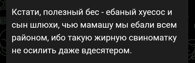 >>1050660 Чеееел, свободный русский человек, такой как ДедП47, любого базопынявого слонированного ватного россиянского хуесоса, вроде унтерменшей и гомункулов типа жмиля и михаса - теоретически может УБИТЬ ударом хуя. Осознавая это - кто будет вообще переживать за копошения обиженных и обоссаных россеянцев в их же навозе? Речь о буквально расовом превосходстве над ватным скотом. Их внимание - это внимание таракана к тапку.