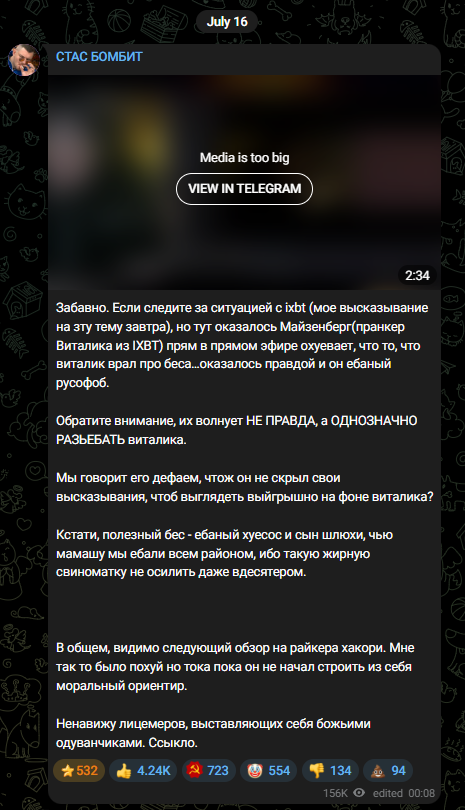 Краткое резюме на конец IXLGBT-games: Отписалось пара десятков тысяч, оставшиеся сплотились вокруг виталика и донатят в двойном размере, дедпи хайпанул, михас хайпанул, майонеззенберга никто как не знал так и не знает, бес хайпанул, стас хайпанул, хохлы опять соснули. Всем спасибо, было весело, увидимся на следующем конце.