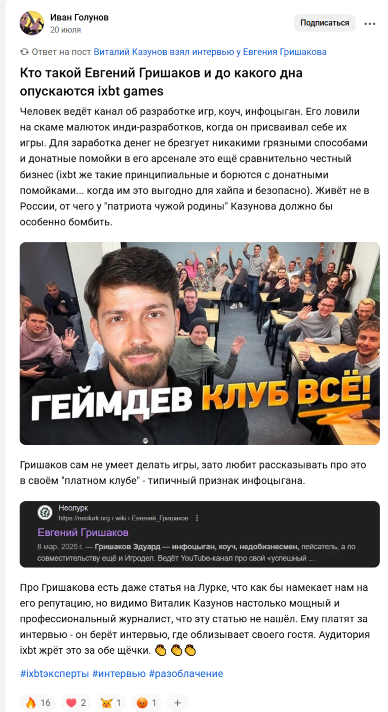 Почему в 2025 году кому-то вообще не похуй на виталямбу и его дружка? Мне казалось что адекваты давно перестали смотреть эту давно зациклившуюся хуету про вечные повесточки, неправильные игровые студии, которые не хотят делать как хочет виталька и пр? Я несмотрел уже несколько лет что там они делают, сейчас ради интереса случайно ткнул в один из недавних видосов, а там все то же что и раньше: "джейсон хуанг уга буга, повесточка инклюзивность ыы, западной индустрии конец". Неужели кого-то не заебало до сих пор это из раза в раз смотреть?