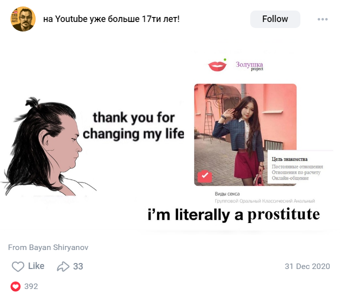 Кек, подпедочурка опять пытается загазлайтить, что его кумир разумный член общества и не стал бы делать такую хуйню. Обычный чел бы действительно не стал, но у нас речь о опущенном педоузбеке с кучей комплексов, который нанимает проституток для имиджа в интернете. Попросить волгоградскую шлюху приклеить розетку и потом выложить это в срикер, мол смотрите она живет со мной, модеры срочно форсите что она моя жина!!!, это даже не в топ 10 кринжовых вещей, которые он делал.