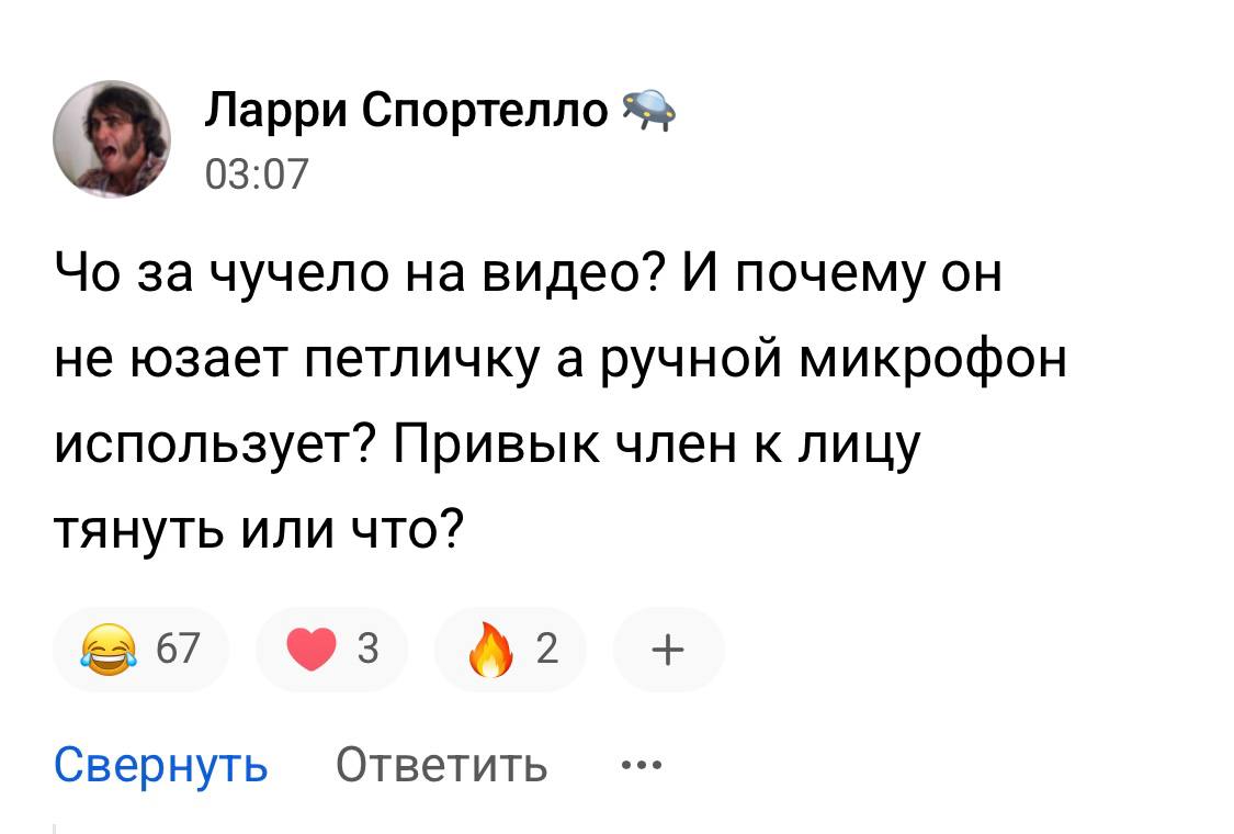 >>1072737 У дурака сельского по осени, по расписанию, фляга свистит С каждым годом всё громче. Чел просто написал ему про рацион и на "вы" Сельское чмо словил шизу, нахамил человеку и возбудиться настолько, что побежал ролик снимать про всю жизнь на спорте. Это пиздец. Реально шизик