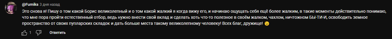 Не, я так-то в ахуе, что так-то оказалось, что ненавистник Бориса - это буквально один шизофреник. В единственном числе. Я думал, что их хотя бы парочка.