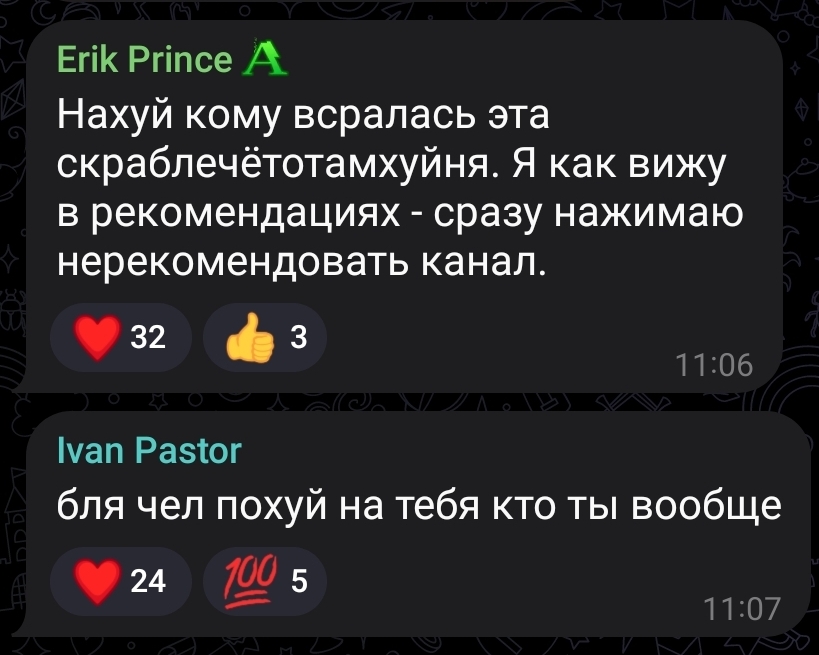 >>1084721 Бсб и этот хуй с флагами (кто это?) это реакция среднего нормиса на поведение Педьки. "Какая-то свинья без остановки хамит, блядь, паясничает, оскорбляет, несёт чушь какую-то — нахуй он нужен вообще? Не будем общаться с таким долбоёбом."