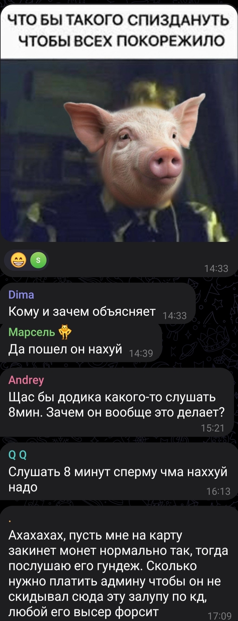 Чот смеюсь как местным школьникам рвёт попец от того что карельская свинка плохо говорит про рашку в своих видео. Хуесосил бы хохлов как его брательник по редеющим волосам и алкашке - был бы нашим броу, слоником и базовичком, никто бы и слова про его жир, семью и внешку не сказал.