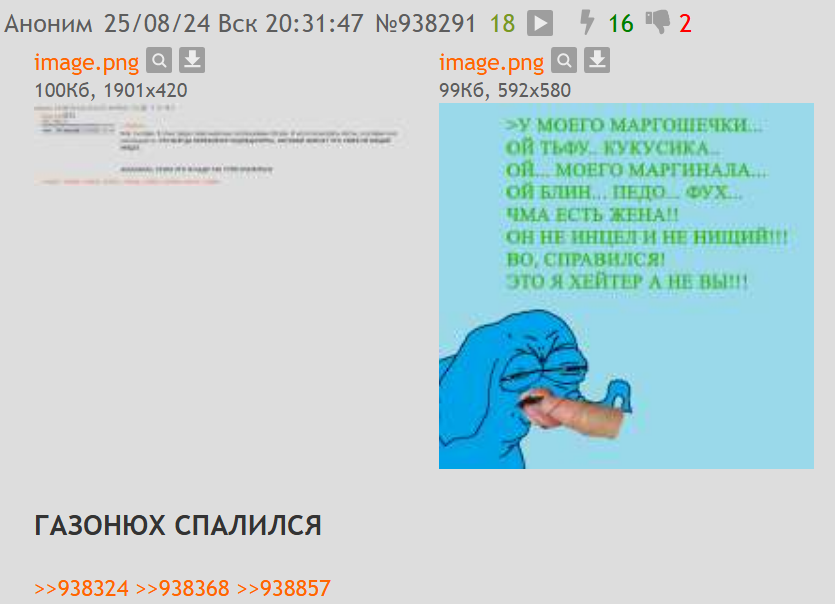 Именно после этого видео газонюх стал активно работать очком в треде. До этого он лениво пукал 2-3 поста в неделю, именно протыкательский видос кекуса подорвал ему жопу. А недавно вышла добивочная от аудио РВ.