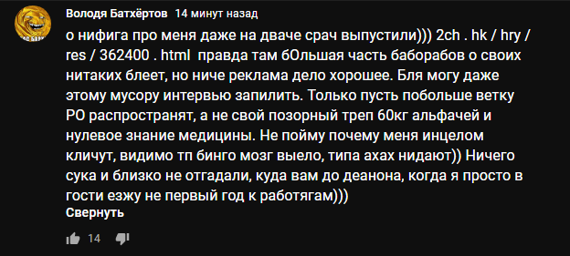 >>362400 (OP) Пиздос, кто-то завел тредик и про этого дауна. Я охуенно рад, блядь. Слежу много лет за этим олигофреном и считаю его пожалуй самым ебовым инцелом всея рунета. Эта ебанашка в своем бреду переплюнула всех МуДэ-петушков и даже пиздобесного >>391486 >>390084