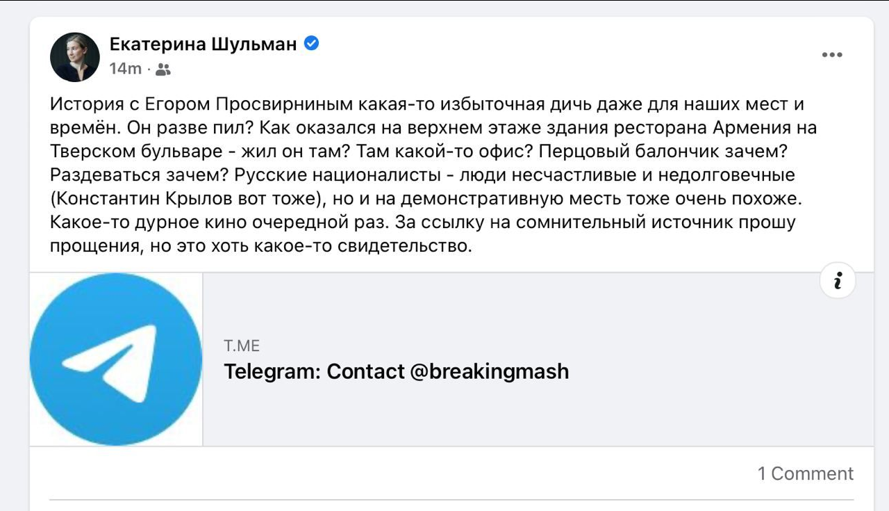 Так, внимание вопрос: Шульман умерла в медийке, как и этот тред, или она все ещё популярна, но на меньшею аудиторию? Как минимум, за былые заслуги. Алсо, есть какие-нибудь забавные шизо идеи, которые она озвучивает, и которые отличаются от мейнстрима либералов.