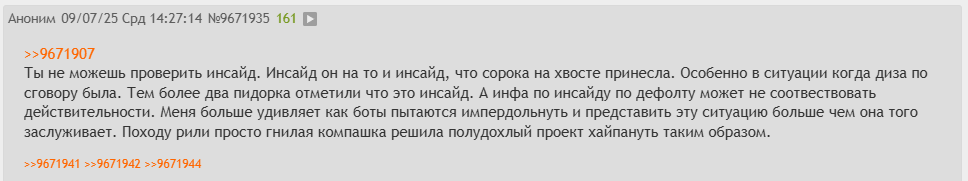 Надеюсь это действительно последний пост по этому срачу...... Бля, я не знаю уже сколько раз повторять. Те, кто говорят, про "не проверили инсайды", такой к вам вопрос. А вы сами вообще знаете как работает журналистика и откуда появляются "инсайды". Бля да даже миша подробно разжевал это в последнем видосе. Обьясняю тебе наглядно. Инсайд это когда нынешний/бывший/приближенный разработчик пишет человеку и сливает информацию. Очевидно, зачастую без существенных пруфов, а иногда если получается с пруфами. И никто, очевидно, не показывает свои имена, паспортные данные и ничего, что поможет идентифицировать человека. И зачастую эти люди ко всему прочему просят об анонимности, ибо за сливы могут получить проблемы. Просто тут очевидное лицемерие, почему-то к "инсайдерам", которые "сливали" инфу и даты релиза ХЛЗ, то им ничего не было за пиздеж. Да и вообщем дахуя случаев, когда реальные журналисты постоянно обсирались на инсайдах, потому что блять это норма) Инсайды есть везде, и будут. И не всегда они подтверждаются. Зайди в любое комьюнити, всегда найдется так или иначе инсайдер, который будет сливать какую-то инфу. А про Виталика могу лишь сказать, что от этого конфликта доверие к ним не пропадает, ибо как пруф он показал в видосе один из баннеров отмененной игры от Zenimax, которого ВООБЩЕ нигде не было и нету