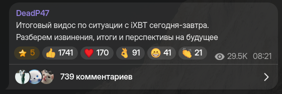 Давайте поиграем в Ваенгу. Учитывая, что на ютуб продолжают заходить, скажем так, не самые добросовестные люди, раскукоживающие ютуб, - все добросовестные в ВК и Рутубе, - которые симпатизируют в основном соевикам и релокантам, а не нашим базовичкам, то думаю, что на Ютубе эта часть аудитории у Иксбт может отвалиться. И на ближайшие видосы просмотров на хайпе еще будет нормально, но потом хайп скиснет и просмотры упадут. А ютуб приносит больше донатов, интеграций и прочего, чем Рутуб и ВК, следовательно доходы у наших слонов, увы, могут просесть. А вы что думаете?