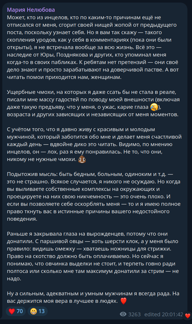 "Добивая тему, всё же коснусь женщин - с их стороны в комментах абсолютный беспросветный кромешный пиздец. Хуй знает, где простому работяге отхватить нормальную тянку, потому что даже у МЕНЯ это исторически выходило просто чудом и счастливым случаем."