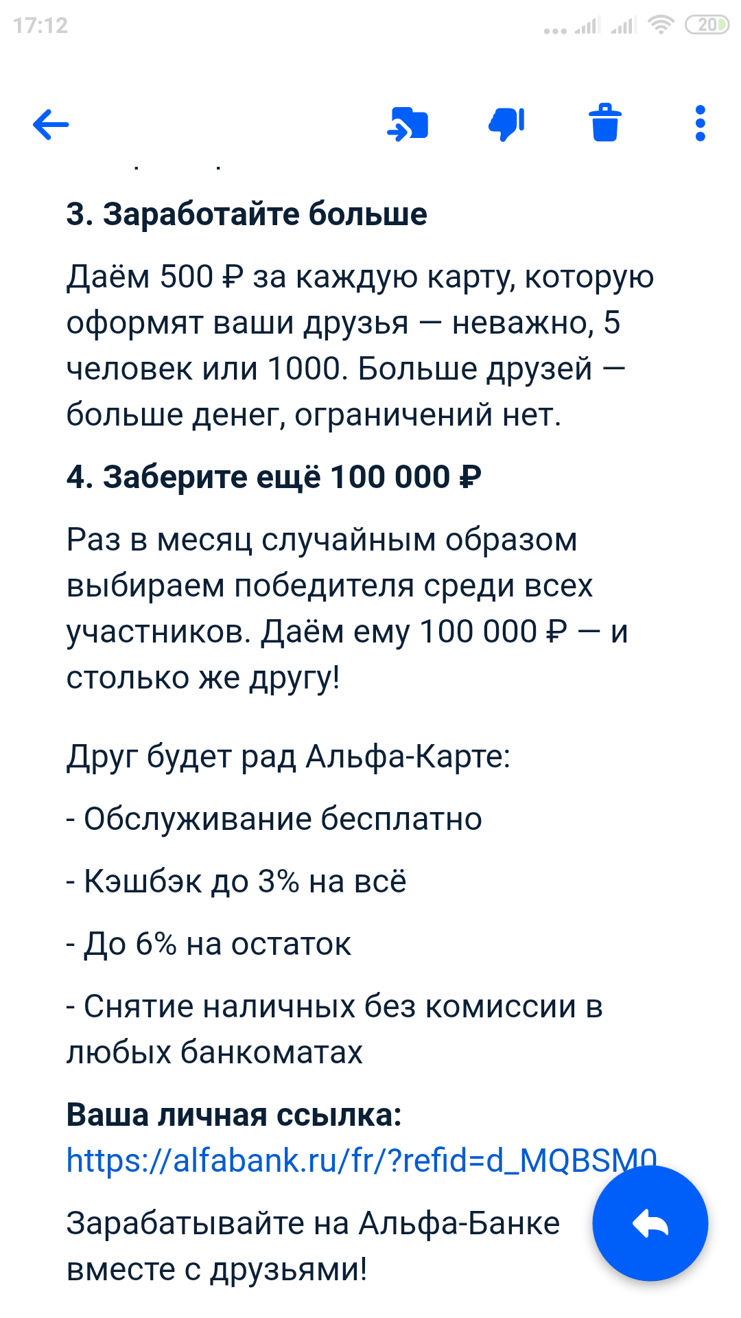 Сап ,двощ нашел способ как заработать 500р потратив немного своего времени Внимание ! Важно ,задание подходит только для тех кто никогда не пользовался услугами Альфа банка и для тех кому 18+ (так же по правилам акции банк имеет право не зачислить оплату при плохой кредитной истории или если есть какие то проблемы с другими банками) Альфа-Банк запустил акцию: платят 500 ₽ каждому, кто закажет бесплатную Альфа-Карту по ссылке друга. Вот моя https://alfa.me/Xm4-fA Мне тоже заплатят . Акция полностью официальная , информация есть на официальном сайте ,но чтобы получить 500 рублей нужно заказать карту именно. ПО МОЕЙ ССЫЛКЕ https://alfa.me/Xm4-fA Переходим по ссылке ,заполняем все данные по паспорту, оформляем карту. Выбирайте карту MASTERCARD, не VISA. Далее тыкаем либо доставку, либо просто отделение банка. Карту готовят в течении 2-3 дней. Если доставка невозможна, ищем ближайшее к вам отделение Альфа-Банка здесь: https://alfabank.ru/office/ и заказываем на него. (ВАЖНО при доставке курьером и так же при получении в банке отказывайтесь абсолютно от всех дополнительных услуг ,иначе бонус не начислятся!) После получения карты Скачиваем их приложение Альфа банк в Play market (если на андроид) или если айфон то скачиваем в Aple Store Активируем карту в приложении.