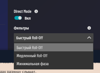 Здесь довольно хорошо описан принцип работы. Если вкратце, современные цапы апсемплят аудиосигнал, который на них подаётся до своей нативной частоты, то есть условно, мы слушаем обычный сидюк 44.1кгц, а частота дискретизации самого цапа 384кгц, поэтому появившиеся промежутки между семплами исходного аудиосигнала заполняются некоторыми усредненным значениями. Алгоритм фильтрации и определяет, каким образом будет дорисовываться звуковая волна, но обычно впоследствии этого появляются артефакты ringing, которые выглядят как небольшие волны перед и после звукового импульса (обычно он не слышен на слух). Так вот подбор фильтра - это выбор некоторого компромисса между точностью импульса и срезом высоких частот. Sharp roll-off - это четкий срез ВЧ на ~20кгц, но довольно заменый рингинг, slow roll-off это плавный спад ВЧ, начиная где-то с 15кгц, из-за чего, к 20кгц уже заметна просадка, но более точная передача импульсов. В прочем, большинство особой разницы между фильтрами не слышит, я юзаю slow только потому что у меня наушники сами по себе имеют сильный подъём на крае ВЧ. А, ну и ещё есть всякие minimum phase варианты, в статье про них написано