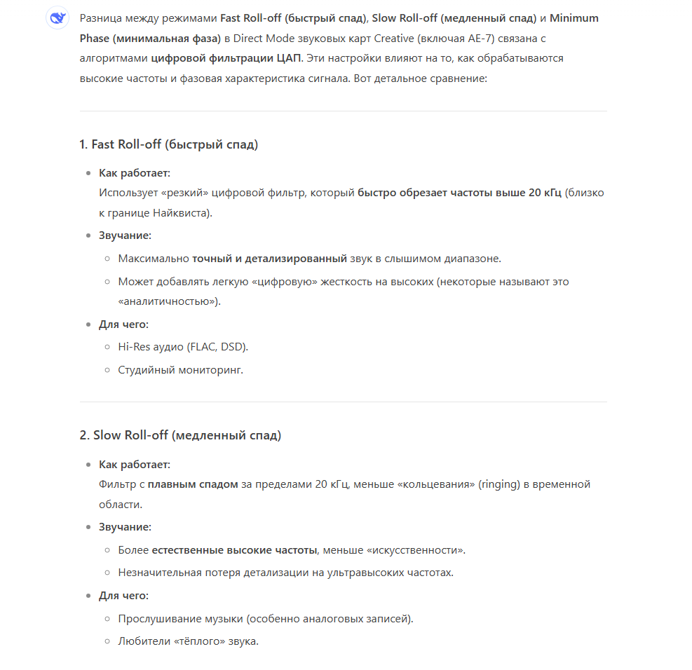 > Они ведь не просто так появились — значит, с этим искажениями многим больше нравится! Вот и подумой Они появились из-за технических ограничений. Подъем баса на низкоомах из-за высокого выходного импеданса, проавл на ВЧ из-за винтажного мультибитного цапа без оверсемплинга, где необходимо задушить ВЧ фильтром, так как там дичайшие гармоники образуются