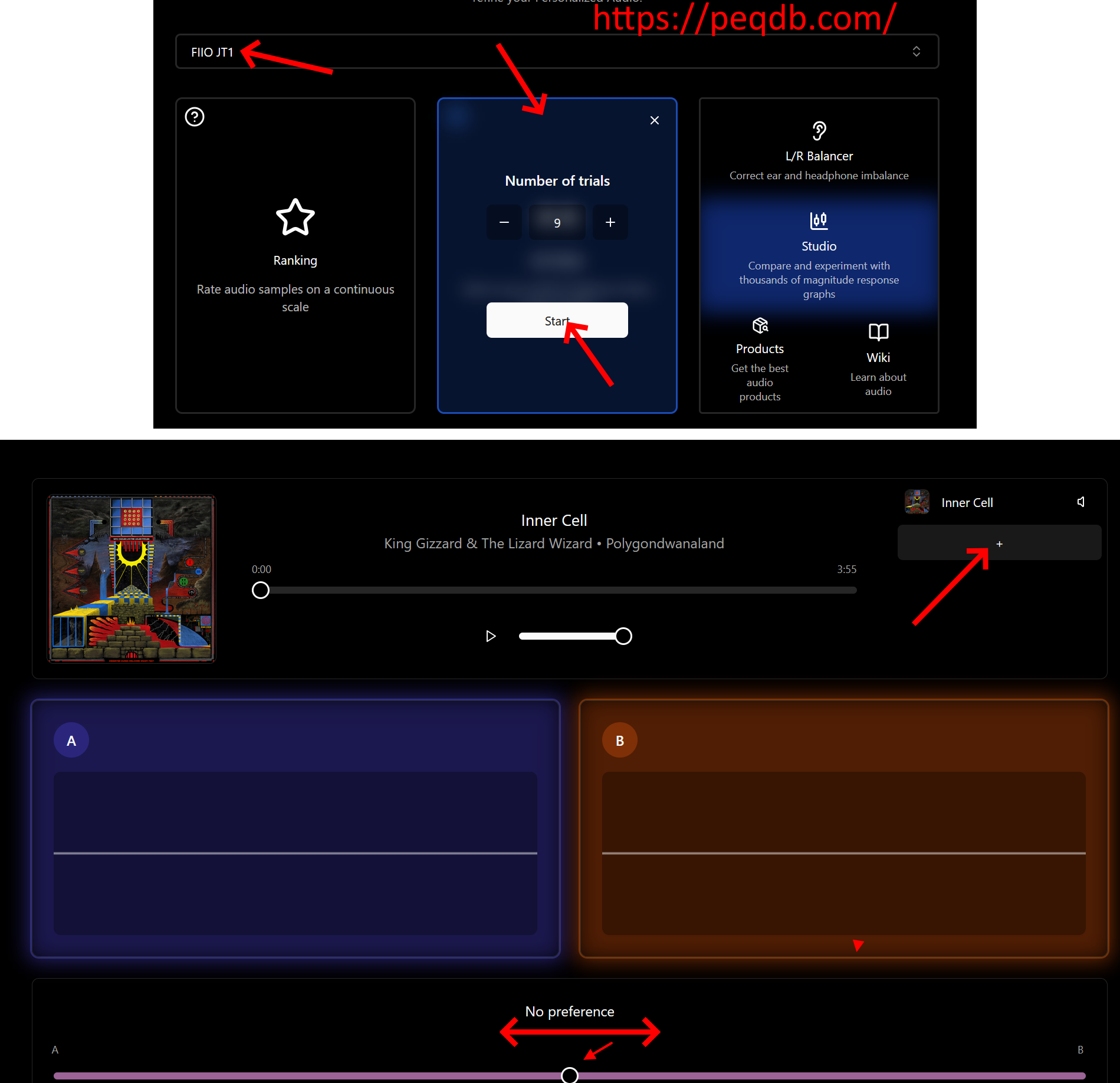 https://peqdb.com/ - настройка под свой слух. Выбираешь в списке наушники, выбираешь режим AB slider, тянешь слайдер пока звук не станет лучше. В конце получаешь пресет. В меню шестеренки можно загрузить свою песню