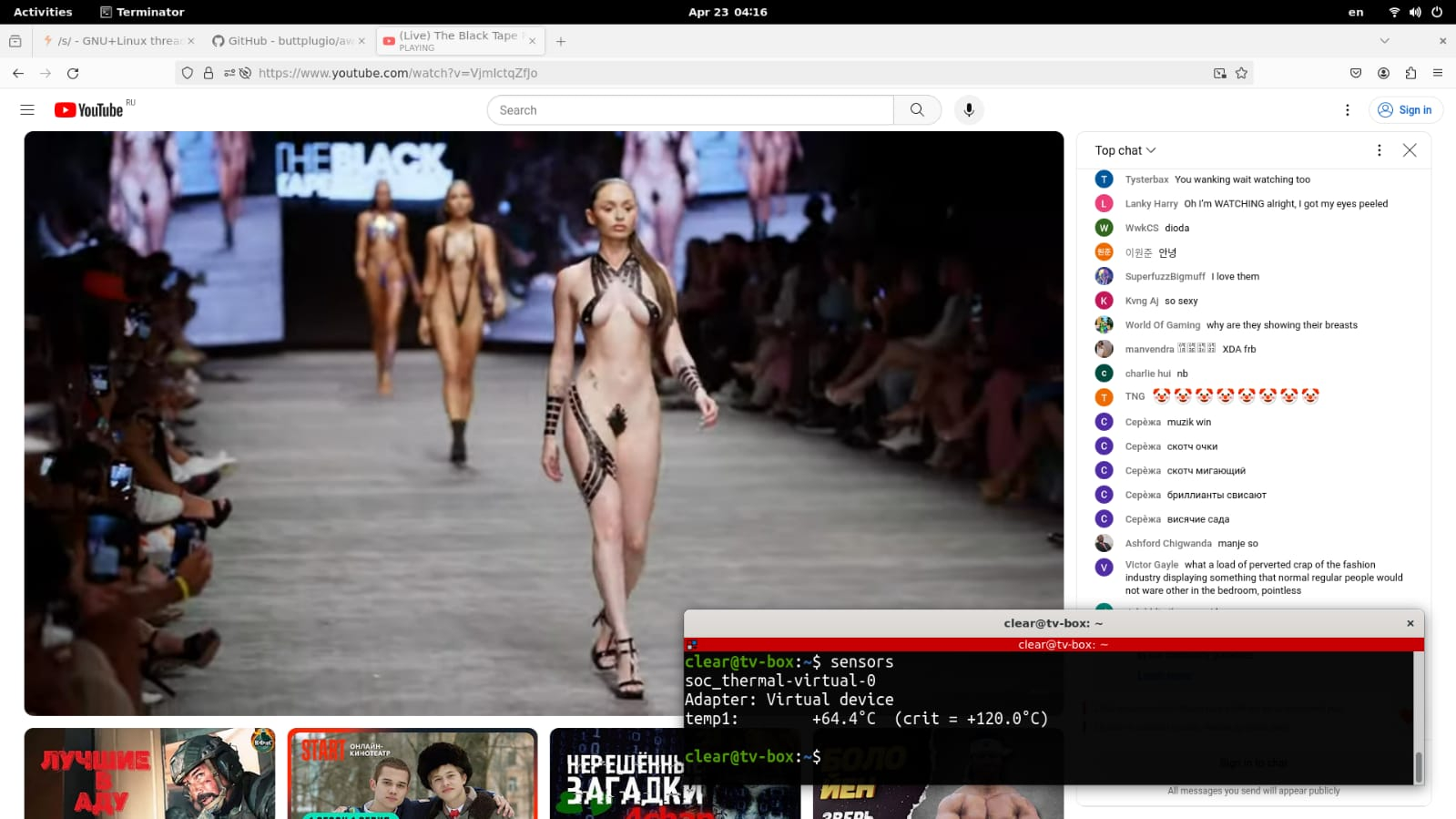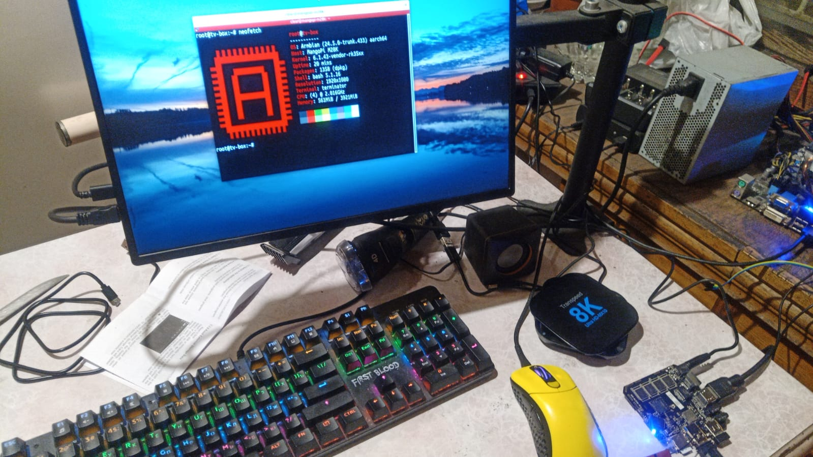 >Что вы там такого делаете на TV боксах Установил линукс. Настроил линукс. Подключил ssd. Протестировал ssd. Установил клиент удалённого рабочего стола. Попробовал РАБотать. Подключил повербанк. Проверил как долго будет работать. Подключил монитор 2к. Посмотрел. Подключил монитор 10 дюймов HD. Посмотрел. Подключил монитор 2 дюйма. Посмотрел. Покекал. Подключил сенсорный дисплей. Потыкал пальцем. Подключил лучевую трубку 4 дюйма. Посмотрел. Покекал. Подключил внешний модуль вайфай 5G. Подключилось. Вернулая к 10 дюймам. Настроил гамму. Настроил.