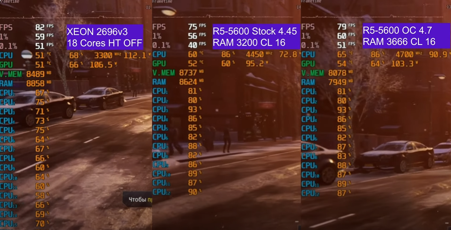 Моя теория, что в таких условиях у процессора забивается конвеер, а с забитым конвеером помогает увеличенный кеш, как и отключение ХТ(ядро перестает делить кеш на два). Если убрать упор в проц, то частота начнет решать и 1% будет выше на 2667в4. Железных пруфов у меня нет да и похуй на самом деле но вот пример из "недавнего" даже более наглядный https://youtu.be/Uo-Jyfgn11I?si=9YpwaWVKxNrQCaw4 обосранный селерон естественно фризит, даже без графика кадра понятно, там 0фпс по редким кадрам, но если создать условия, когда нет упора в проц, то чудесным образом появляются 30фпс.