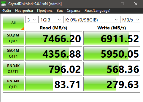Подставляем циферки с картинок по всем тестам. Для SEQ1M Q8T1: 3403.14 x 1048576 : 1000000 = 3568.45 Мегабайта в секунду. Для SEQ1M Q1T1: 17455.32 x 1048576 : 1000000 = 2581.2061 Мегабайта в секунду. Для RND4K Q32T1: 153434.33 x 4096 : 1000000 = 628.467 Мегабайта в секунду. Для RND4K Q1T1: 17455.32 x 4096 : 1000000 = 71.4969 Мегабайта в секунду.