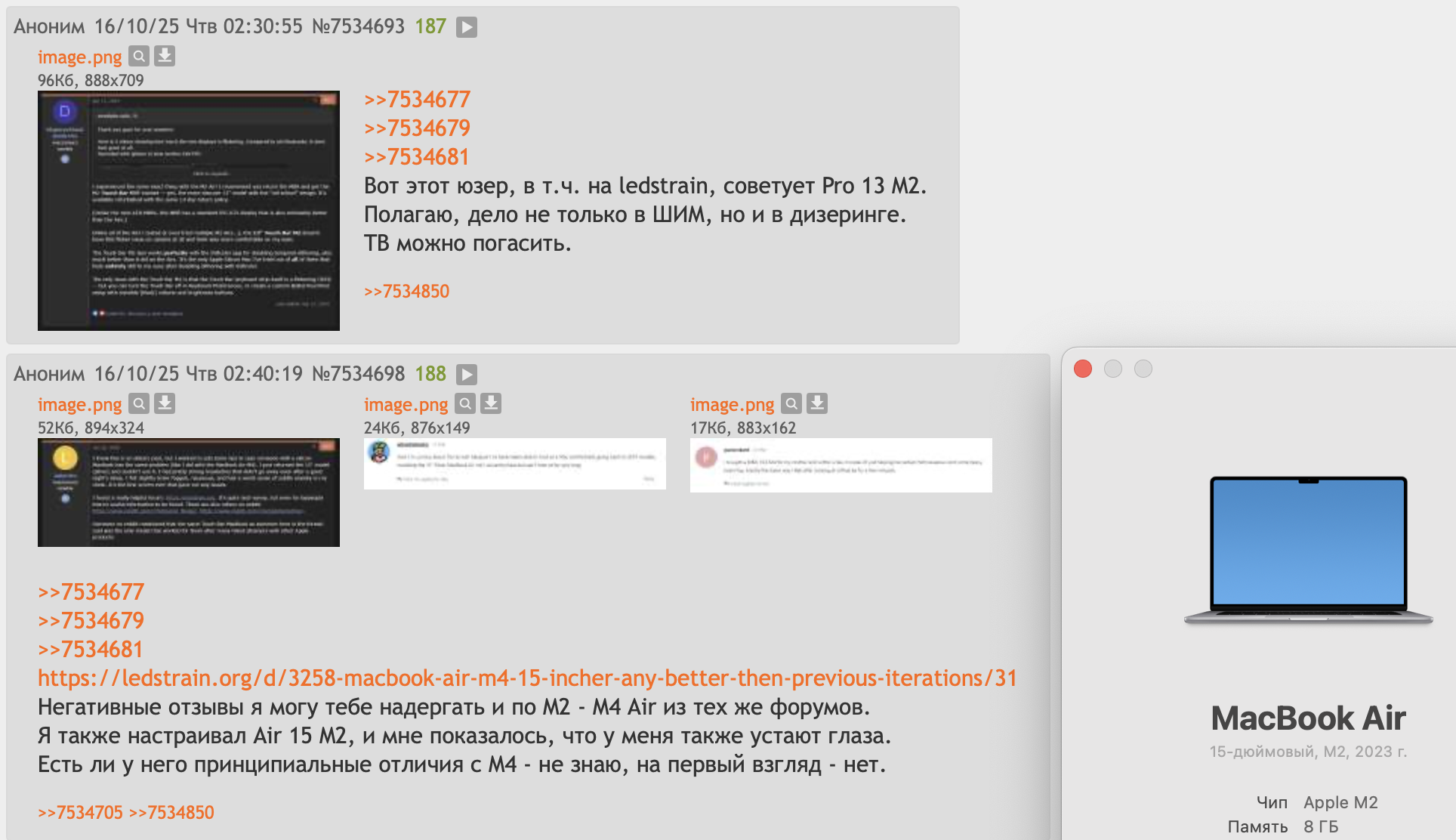 >>7534705 >Разница между постами час Пик-3 - человек помогал настраивать 13" Air. Я написал о том, что я также помогал настраивать 15" Air и почувствовал усталость, но при этом я не настраивал дисплей под себя. Если бы дело было только в ШИМ, то проблема бы решалась легко, но на ledstrain есть ветка по M-макам на 1200 постов, в которой в т.ч. обсуждаются Air, у которых нет ШИМ.