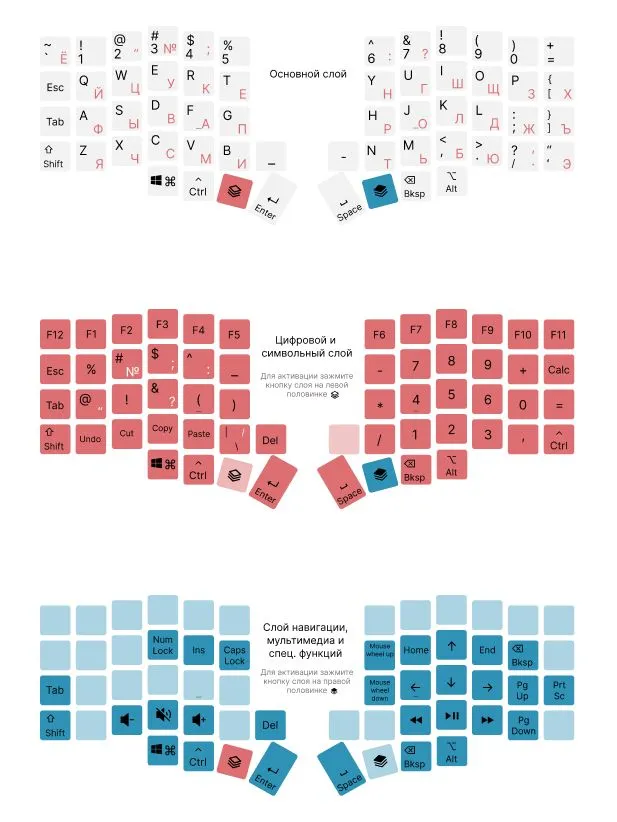 >>7537693 Вот как раз в этой раскладке Alt - это долгое нажатие на нижнюю правую кнопку [э] на основном слое, то есть тот самый tap-hold. Это раскладка у клавиатур производителя "Восход", у меня такая есть, и это удобная раскладка. На четвертый слой добавил только управление мышью, в остальном все устроило.