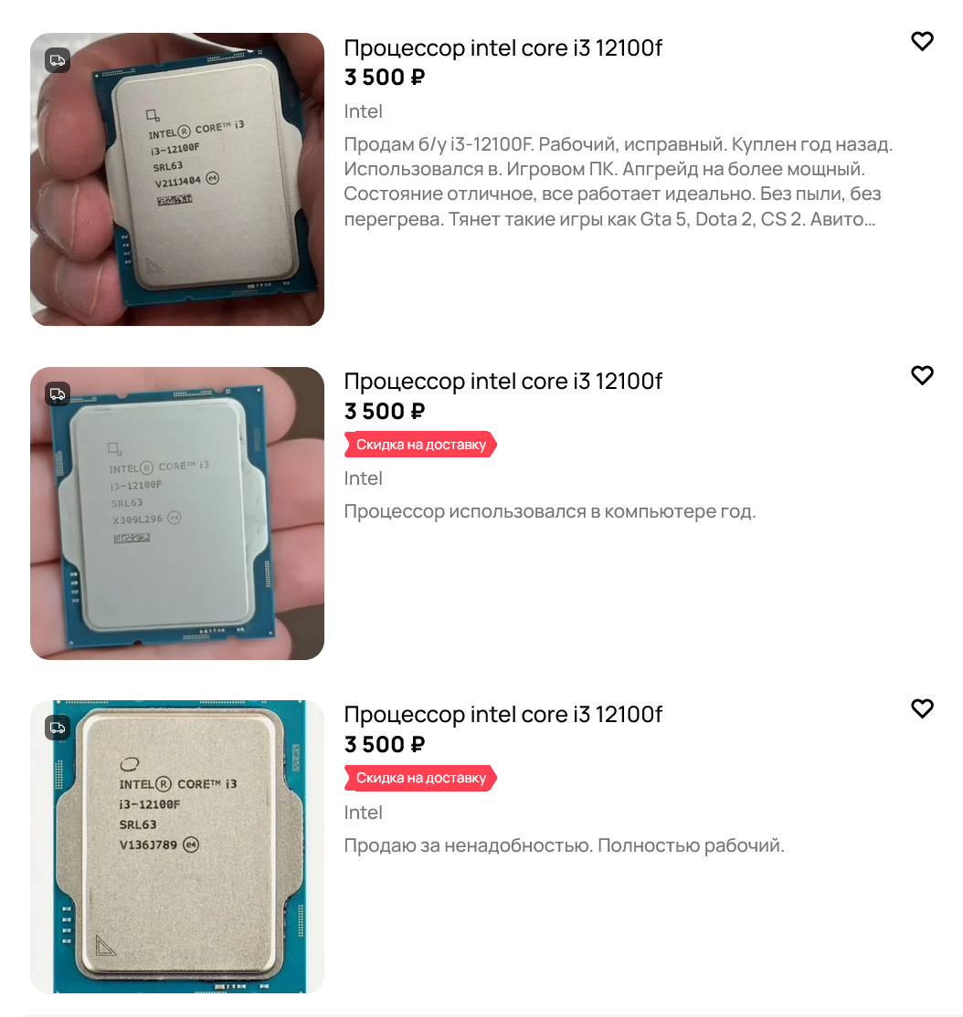 А что случилось с авито? Я ничего не могу найти. Город стоит мой (СПБ), начинаешь листать - вперемешку два предложения из Питера, остальные из какой-то залупы. Комплектов 12100, 10100 и пр. нету или 1,5 штуки. Еще кто-то тут на зеон с вайлдбериса ругается, да идите вы нахуй со своим авито. Тем более там цены ту зе мун сделали и половина продавцов не отвечает на сообщения. Да проще комплект зеона взять, чем носиться по городу пытаясь это всё по частям.